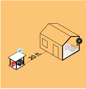 - NEVER use a generator indoors, as it produces deadly carbon monoxide. Place it outside, at least 20 feet away. Monitor inside air with a carbon monoxide detector that has new batteries.