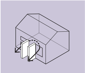 Coloque ventanas paralelas para maximizar el flujo de aire constante. Recuerde que esto solo ventilará el área por donde el viento pase. NO se recomienda dado que contradice la imagen mostrada anteriormente. Esto crea un efecto de túnel de viento. No es aconsejable, ya que no facilitará el cruce de vientos.