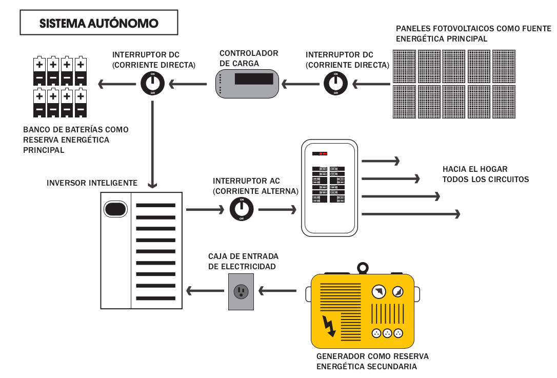 • Un inversor autónomo convierte la energía almacenada en las baterías, transformando eléctricamente la corriente continua (CC) a corriente alterna (CA).