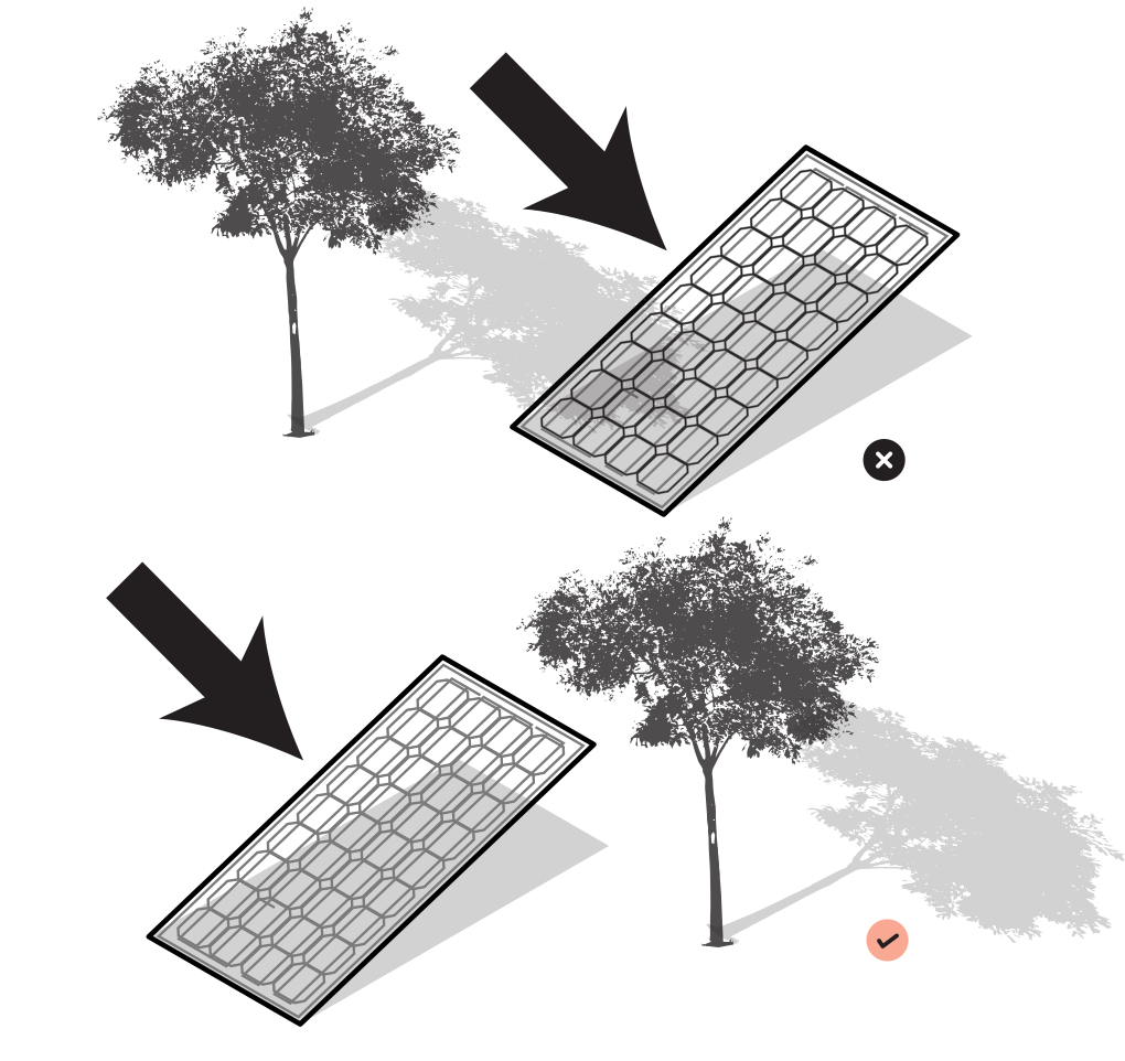 • Evite colocar paneles cerca de árboles ya que la sombra afectará la eficiencia del sistema. .