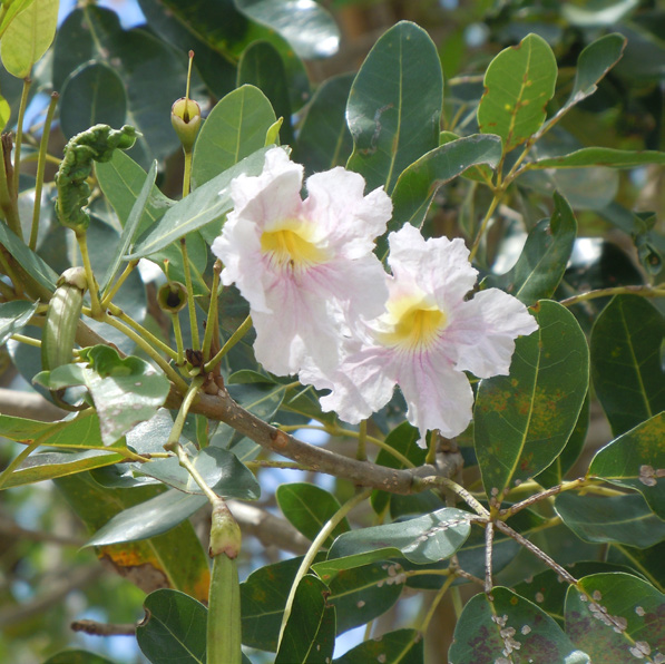 A medium tree that can reach 60 feet. Its flowers are pink and tubular. Its delicate white seeds can be dispersed by the wind.