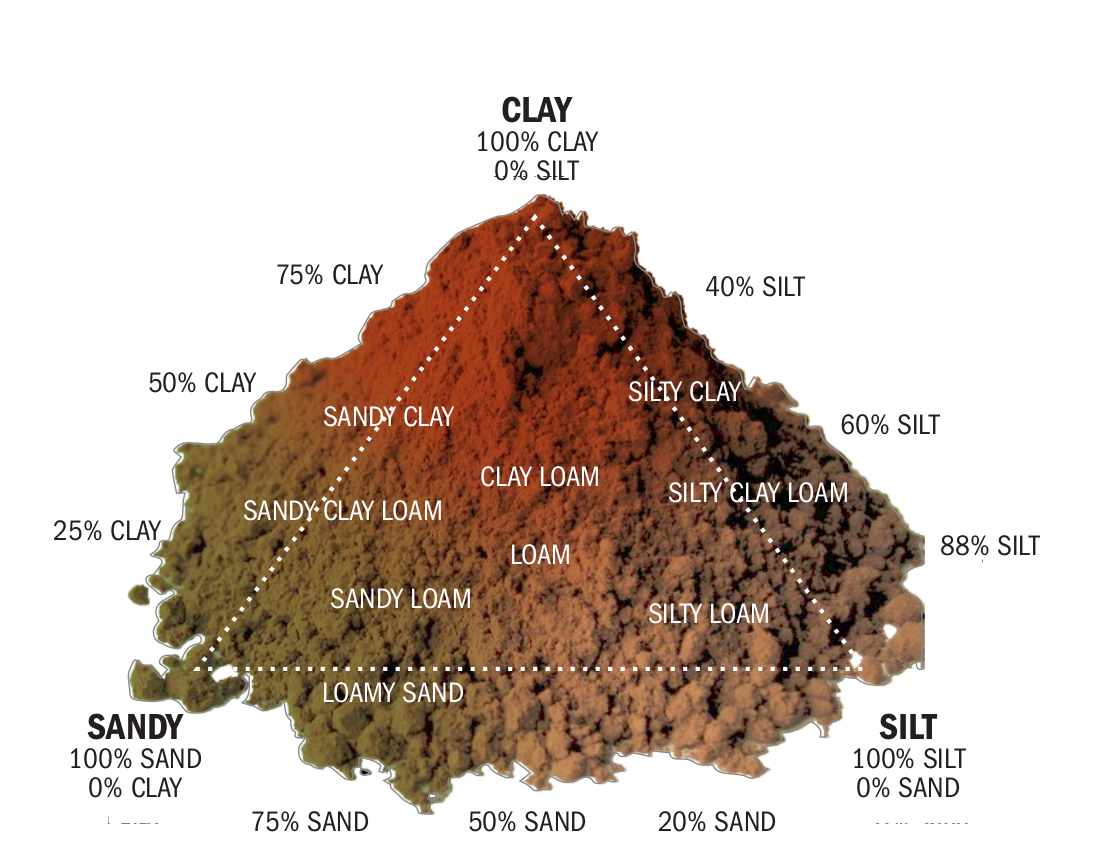 There are several factors that determine the type of soil in an area: composition, climate, topography, plant activity, and minerals. The consistency of the soil can be classified as silt, sand, or clay. Sandy soil is found in rivers and beaches and is very loose and easy to work with, but has few of the nutrients that a plant may need. Silt is fertile and easy to work with. Clay has small particles and is very heavy when wet, making it difficult to work with. The combination of the three soil types—that is very fertile—is known as loam.