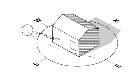 • The critical facades for heat gain are east, south, and west. Lower sun angles on the east and west sides of a building mean greater heat gain for east and west facing windows and walls. To minimize morning and afternoon heating, orient a building such that the longer sides (typically having more windows) face north/south, and the narrower sides (with less windows) face east/ west. See Strategy 11 for more on orientation of windows.