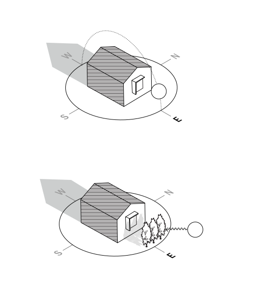 • Plant tall shrubs or short trees on West side to reduce afternoon direct sunlight.