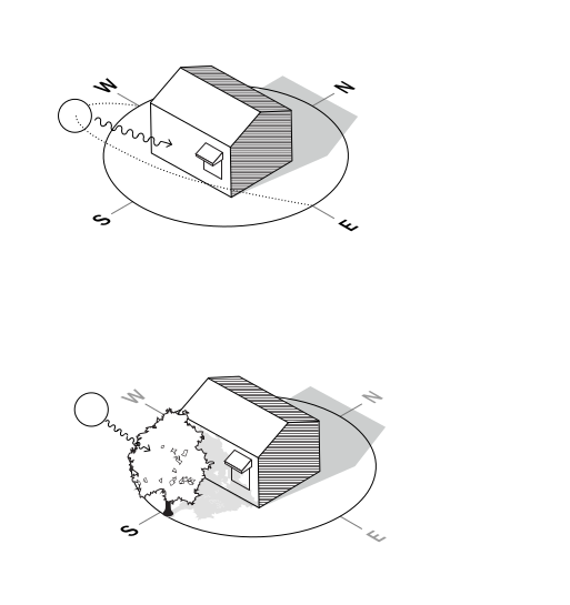 • The foliage of the tree provides the most shade. Ensure that the tree’s height and location will cast shade on the right surface, at the desired time of the day.