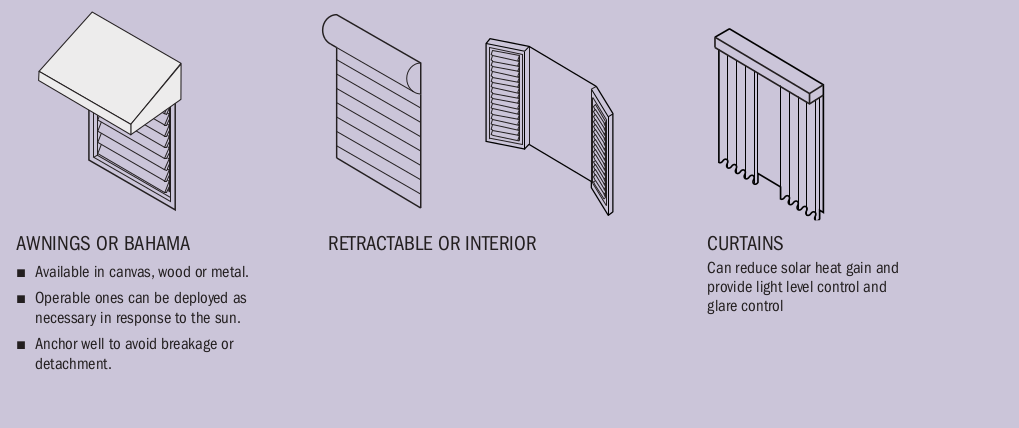 • Horizontal shading over a single south-facing window provides good shading year round. Porches, overhangs, and awnings provide similar effect, see examples below in #4.