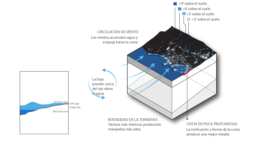 - Inundaciones costeras y marejadas ciclónicas, que son inundaciones en la costa, principalmente ocasionados por marejadas ciclónicas en las áreas costeras. Las marejadas ciclónicas ocurren cuando el aumento del nivel del agua generado por una tormenta es mayor que las mareas astronómicas previstas. Este aumento en el nivel de las aguas puede causar inundaciones extremas en las áreas costeras, particularmente si la marejada ciclónica coincide con la marea alta normal, ocasionando marejadas ciclónicas de hasta 20 pies de alto, o más algunos casos. El aumento del nivel del mar continuará agravando los efectos de los peligros en las zonas costeras, incluidas las marejadas ciclónicas.