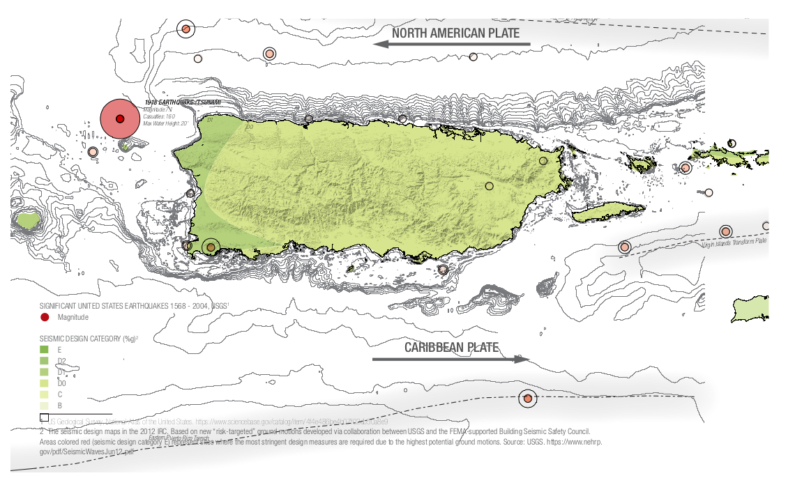 - Puerto Rico está cerca de la zona de subducción entre las placas tectónicas de Norteamérica y del Caribe, ubicado justo en una de las rutas más activas de huracanes, lo cual expone a la isla a varios peligros, tales como derrumbes y tsunamis.