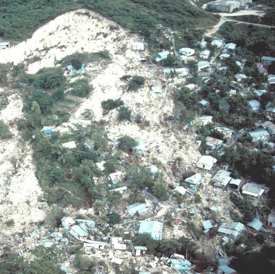 Licuefacción: la presión del agua aumenta en el sedimento del suelo y los granos de arena pierden contacto entre sí, haciendo que el sedimento fluya como líquido. La mayoría de los casos de licuefacción occurre en áreas que se han rellenado artificialmente. Aproximadamente 45% del área metropolitana en San Juan se ha construido sobre planicies costeras y antiguos humedales, lo cual hace que estas áreas sean sumamente propensas a la licuefacción.- Deslizamiento de tierra: es el movimiento cuesta abajo de las rocas o la tierra (o ambas) que ocurre en la superficie de la ruptura. Los deslizamientos de tierra pueden desencadenarse como consecuencia de aguaceros o terremotos y a menudo pueden suceder súbitamente y moverse con rapidez.