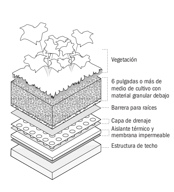 Los techos que están parcial o completamente cubiertos de vegetación y un medio de cultivo mitigan el aumento excesivo de calor y manejan las aguas pluviales.- Los techos verdes se clasifican por la profundidad del medio de cultivo o suelo utilizado, lo que determina las especies que pueden sembrarse allí.