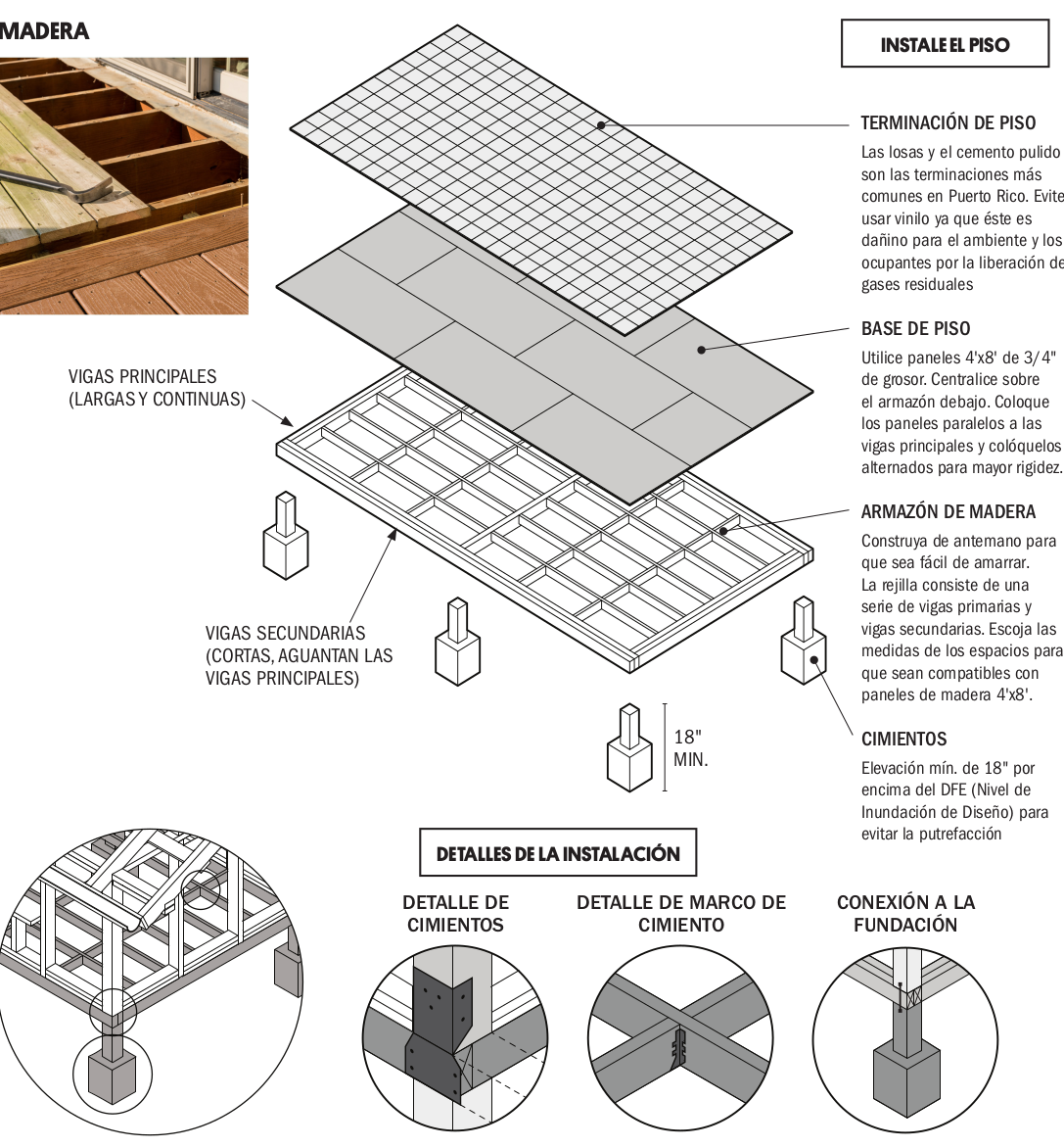 Asegúrese que el cimiento cumple con los códigos IRC 2018 e IBC 2018 (adoptados por el Código de Los contratrucción de Puerto Rico [PRBC, por sus siglas en inglés]), las provisiones estructurales y ASCE 7-16 y ASCE 24-14 (adoptadas por referencia a IBC e IRC).