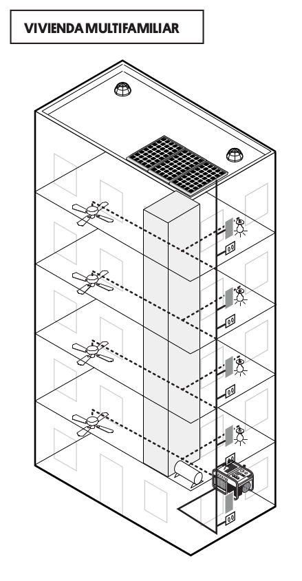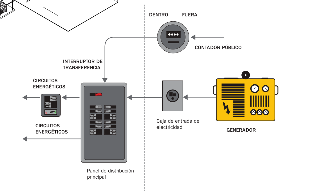 - Asegure que el panel de distribución principal, el equipo de emergencia y los tomacorrientes estén en el mismo tablero de distribución para que sea más fácil controlar el generador.