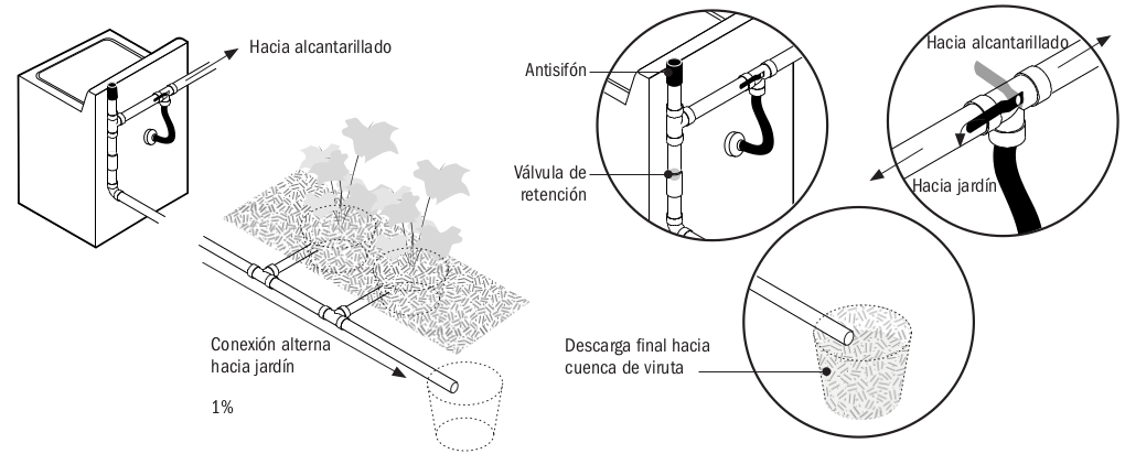 - Este método conlleva un riesgo de crear un reflujo de agua estancada hacia la lavadora. Vea la Estrategia 22.