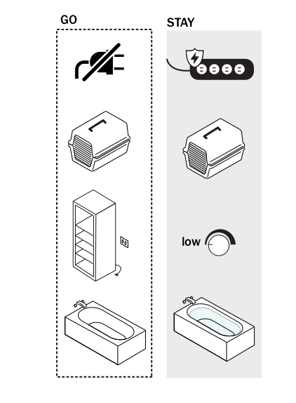 - Mantenga sus mascotas en un lugar seguro. Ubique las mascotas en una habitación o jaula para poder recogerlas rápidamente cuando esté listo para desalojar o trasladarse a un refugio.