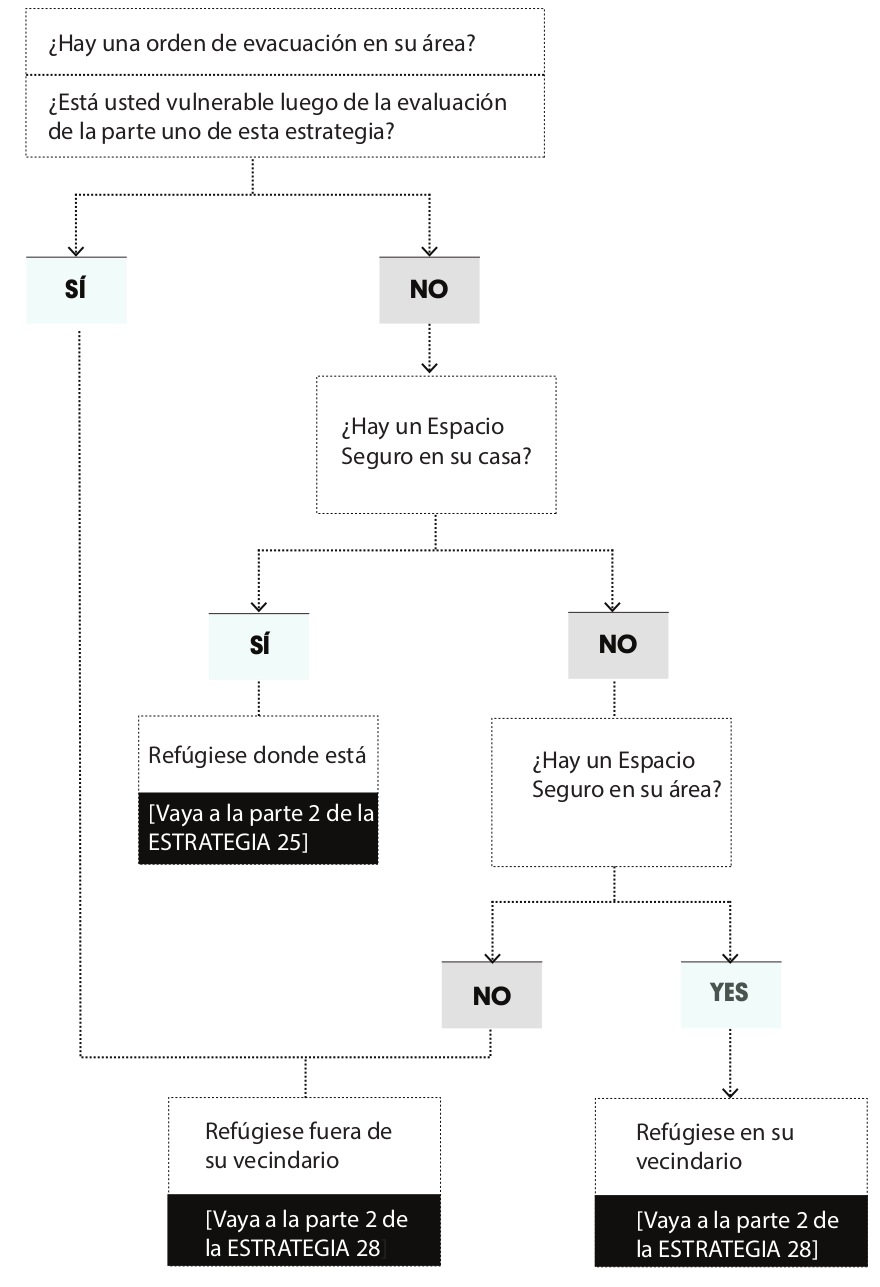 | Cuando se acerca un desastre previsto, lo primero que debe preguntarse es si debe desalojar el área con su familia, quedarse en casa (refugiarse en casa) o evacuar a un refugio cercano. Los huracanes avisan su llegada con varios días de anticipación, pero no hay forma de prever muchos otros desastres naturales. Esta estrategia le ayudará a determinar las mejores opciones para manejar todo tipo de condición y actuar según corresponda. | Estrategia en Acción 1. Comprenda las vulnerabilidades de su hogar a. Considere las dificultades que cada persona pueda enfrentar b. Entienda los riesgos en su edificación c. Entienda los riesgos en su área 2. Decida si debe quedarse o desalojar |