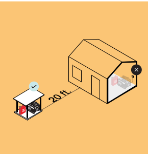 - NUNCA utilice un generador dentro de su hogar ya que produce niveles mortales de monóxido de carbono. Coloque el generador en el exterior (por lo menos a 20 pies de distancia de su hogar). Monitoree el aire del interior con un detector de monóxido de carbono que tenga baterías nuevas.